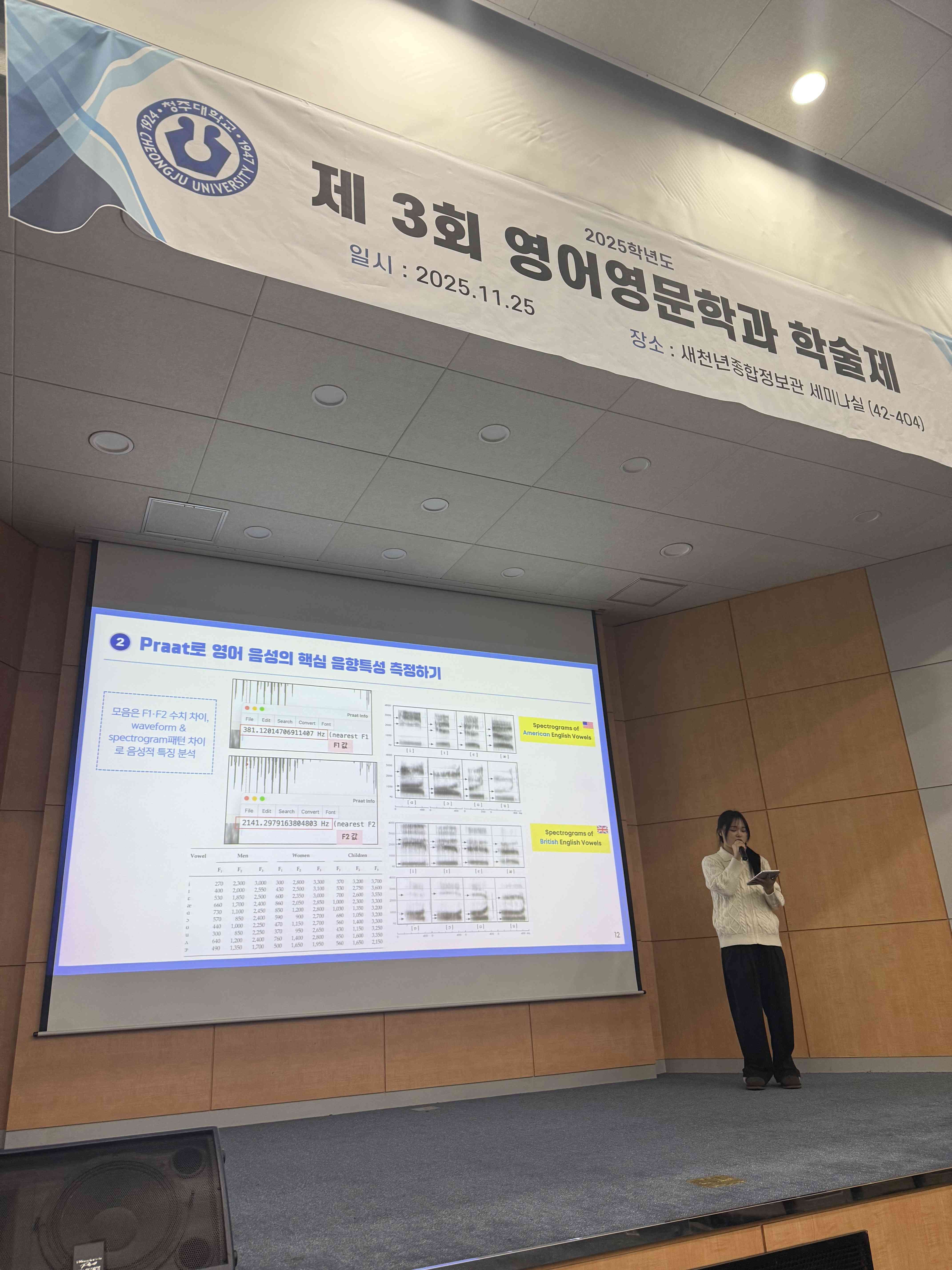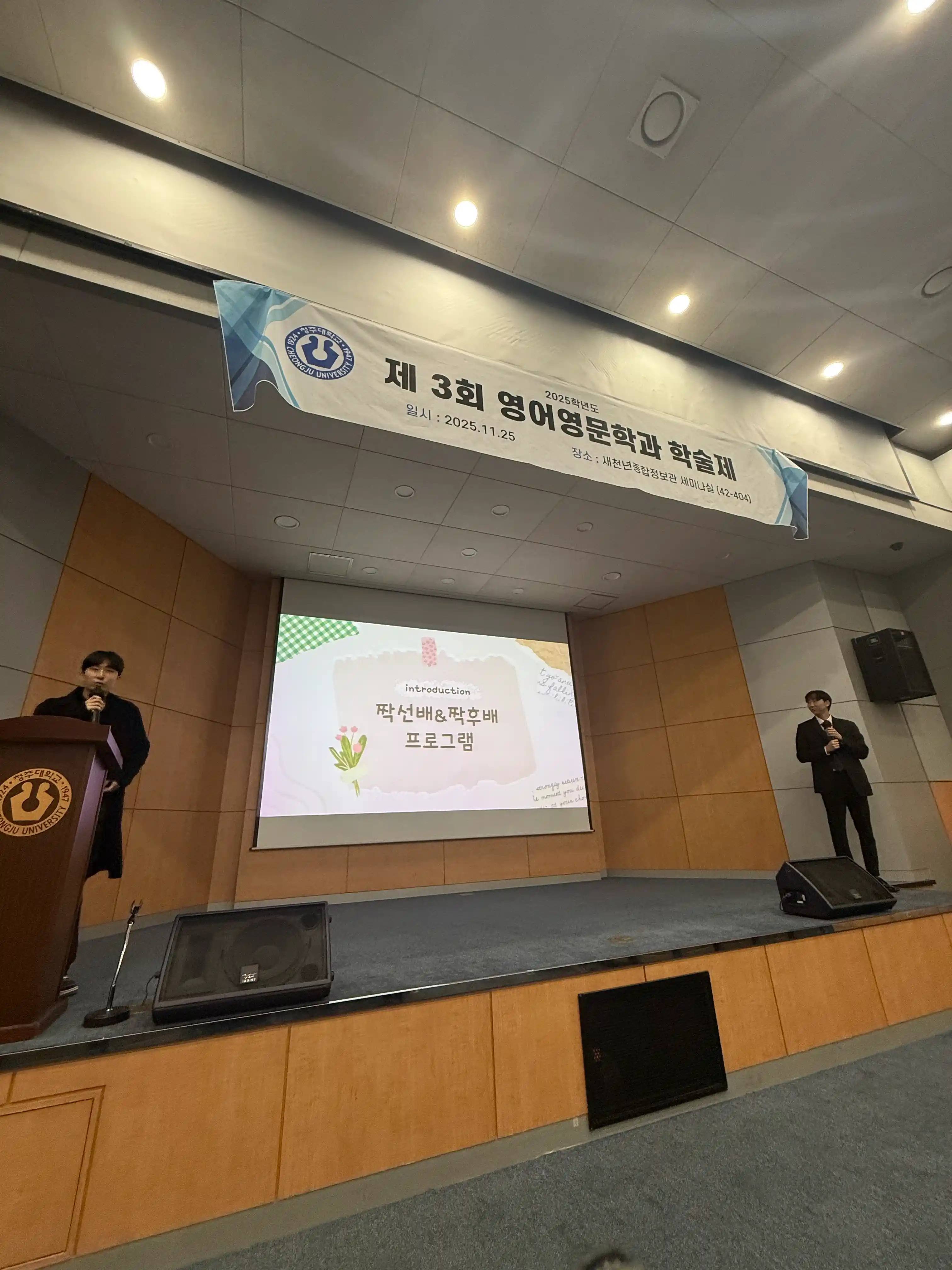 최우수상을 수상한 이유찬·신정훈 학생은 짝선배·짝후배 학과 프로그램 참여 경험을 소개하며 학과 내 멘토링 활동의 의미와 후배들에게 전하고 싶은 조언을 나누었습니다. 우수상을 수상한 임은주 학생은 2025 하계 글로벌 해외연수 및 미국 인턴십 프로그램에 참여한 경험을 공유하며, 현지에서 어떤 업무를 했는지와 그 과정에서의 느낀점 등을 들려주었습니다. 장려상을 수상한 조예림·이지현 학생은 <영어발음분석>교과목의 주요 실습 내용을 소개하는 발표를 하였습니다. 세 팀의 발표 이후에는 배수영 교수님께서 2025학년도 2학기에 신설된 <취업실전영어–캡스톤 프로젝트> 교과목의 주요 학습 내용과 실제 진로 준비와의 연계성을 소개해 주셨으며, 이어 학생회에서 준비한 학과 관련 퀴즈 이벤트가 진행되어 즐겁게 마무리되었습니다. 이번 학술제는 전공을 기반으로 한 학습 경험뿐만 아니라 학과 프로그램을 통해 느낀 소통과 성장의 순간들을 함께 나눌 수 있었던 풍성한 자리였으며 따뜻한 격려 속에서 마무리된 이번 행사가 앞으로의 학과 활동에도 밝고 긍정적인 활력을 더해줄 것으로 기대됩니다. https://www.youtube.com/shorts/0Q4gow6c92E |