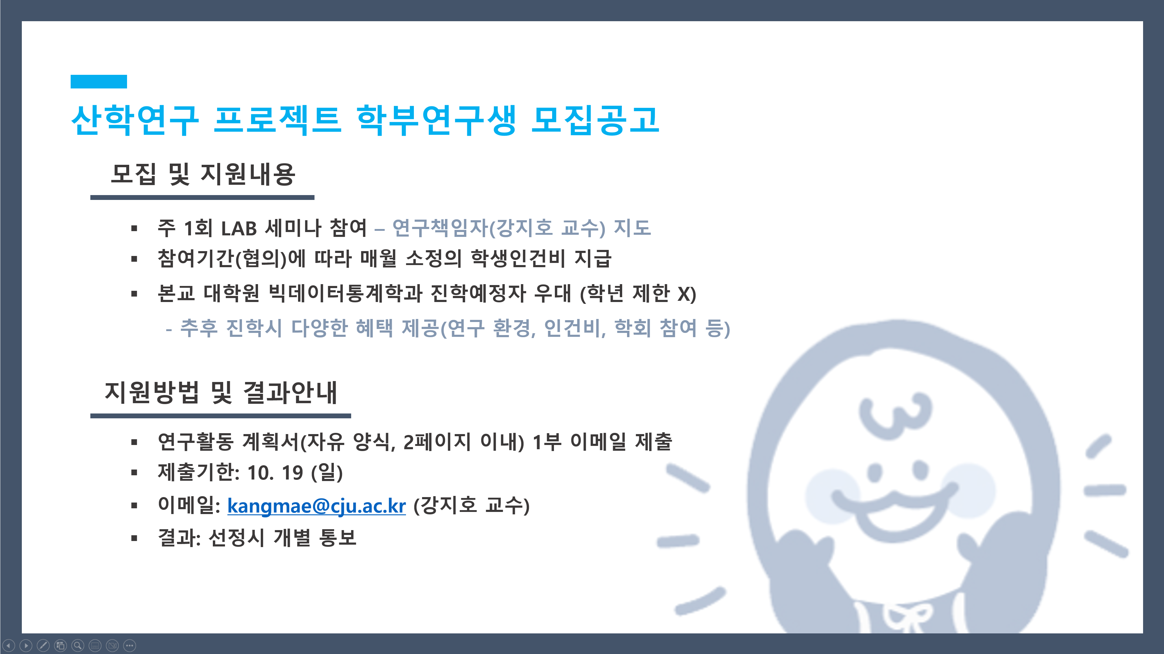 모집내용 -참여 조건 : 주 1회 LAB 세미나 참석 -지원혜택 : 참여기간에 따라 소정의 학생 인건비 지급 -우대사항 : 본교 대학원 빅데이터통계학과 2026년 3월 입학 예정자 -대학원 진학 시 특전 1. 등록금 및 연구비 지원 2. 연구공간 제공 3. 학술대회 참가 지원 지원 방법 -제출서류 : 연구활동계획서 1부 (A4 1매) -제출기간 : 10월 19일(일)까지 -제출처 : 박상성 교수 (이메일 hanyul@cju.ac.kr) -제출서류 : 연구활동 계획서(자유양식, 2페이지 이내) 1부 이메일 제출 -제출기한 : 10월 19일(일)까지 -제출처 : 강지호 교수 (이메일 kangmae@cju.ac.kr) 선발절차 -제출 서류 검토 후, 차주 선발자에게 개별 통보 예정 |